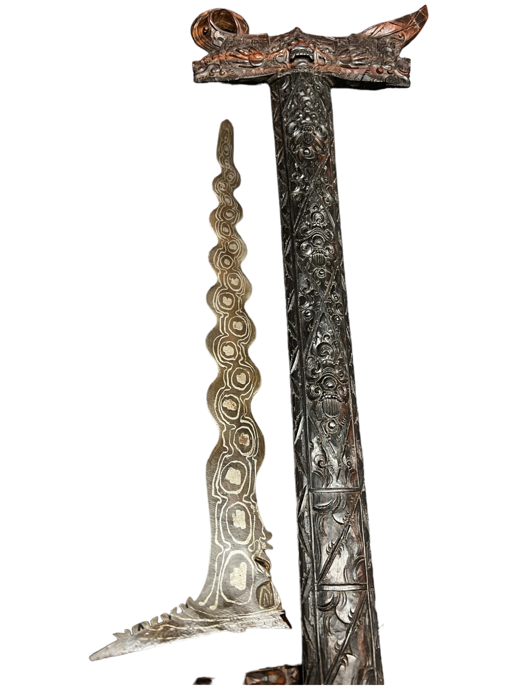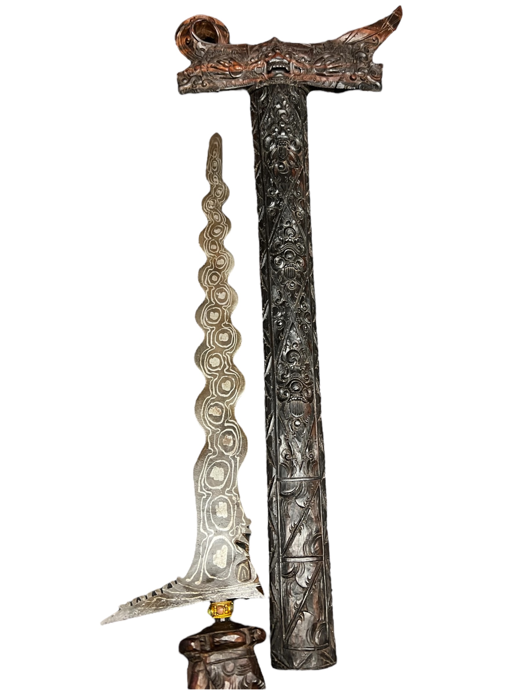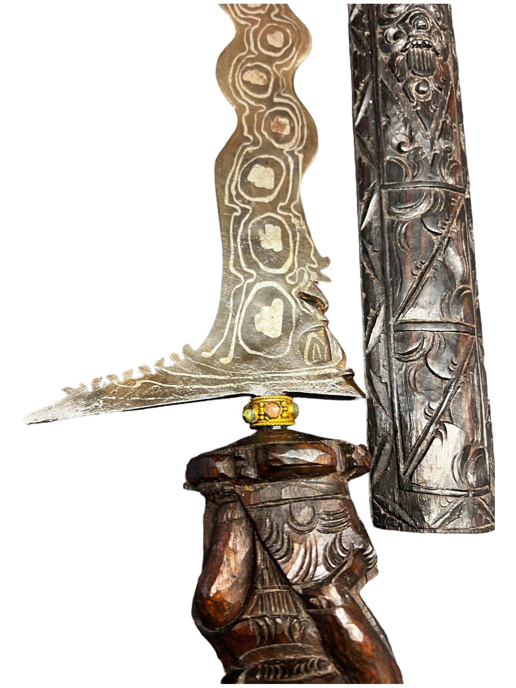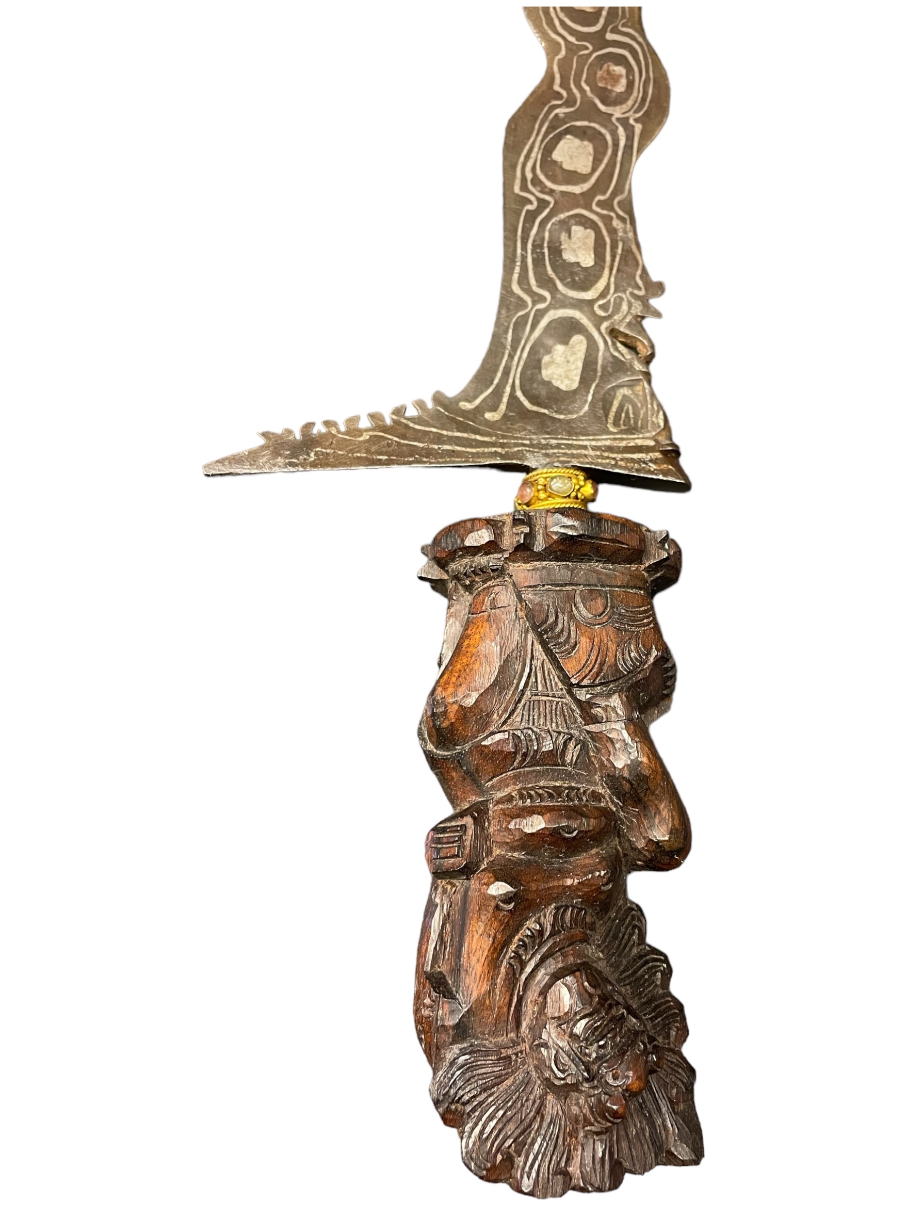 Authentique poignard à lame serpentine en acier caractéristique du monde malais (Indonésie, Malaisie, Singapour, Brunei, Philippines et sud de la Thaïlande).